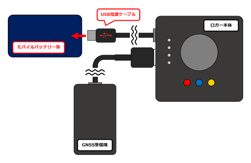 電源をONにする際は、ロガー本体にGNSS受信機が接続されていることを確認してください。