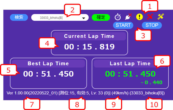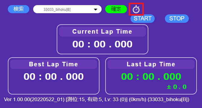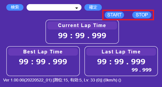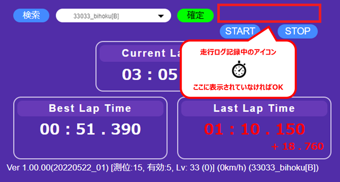 「START」ボタン を押して、走行ログの記録・ラップタイムの計測を開始します。