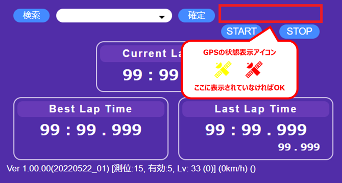 より正確な走行ログを記録するためにも、走行ログの記録やラップタイムの計測を行う前に、GPS衛星の測位状態をご確認いただくことをお勧めします。