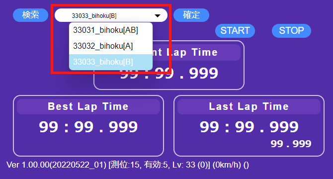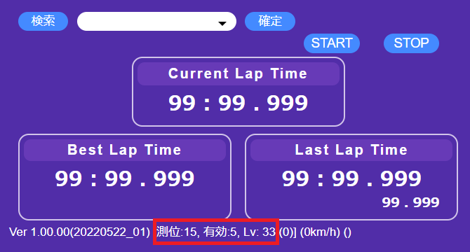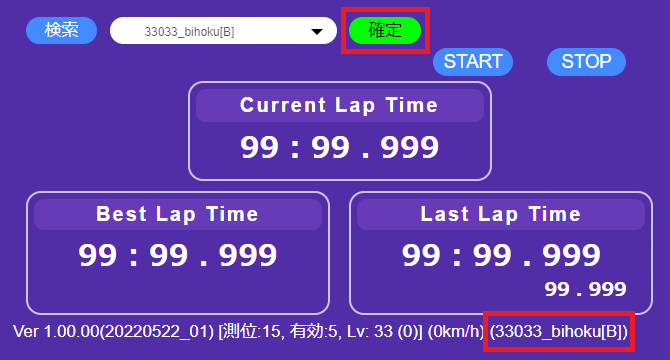 ラップタイムの計測を行う場合に、タイム計測ラインを確定すると、確定したタイム計測ライン名が表示されます。