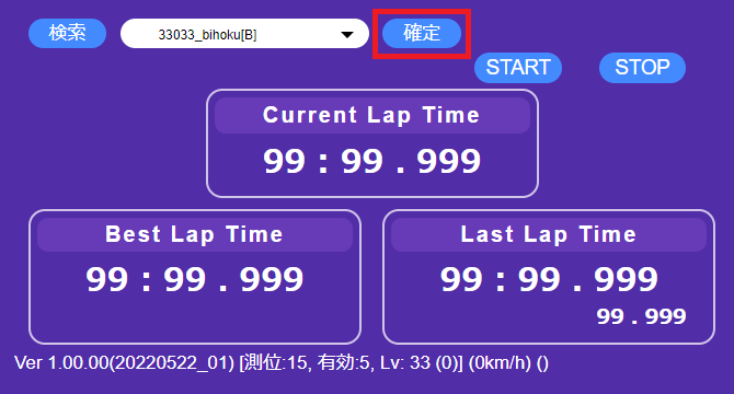 「確定」ボタン : 選択したタイム計測ラインを確定します。確定すると、ボタンの背景色が 緑色 に設定されます。