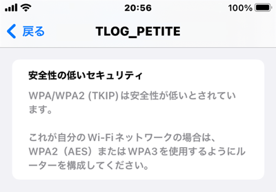 iOSをお使いの場合、Wi-Fi設定画面に「安全性の低いセキュリティ」と表示されることがありますが、Wi-Fi接続で使用するネットワークは、ロガー本体とお使いの機器との間に作成される一時的な閉域ネットワークであるため、安心してお使いいただけます。